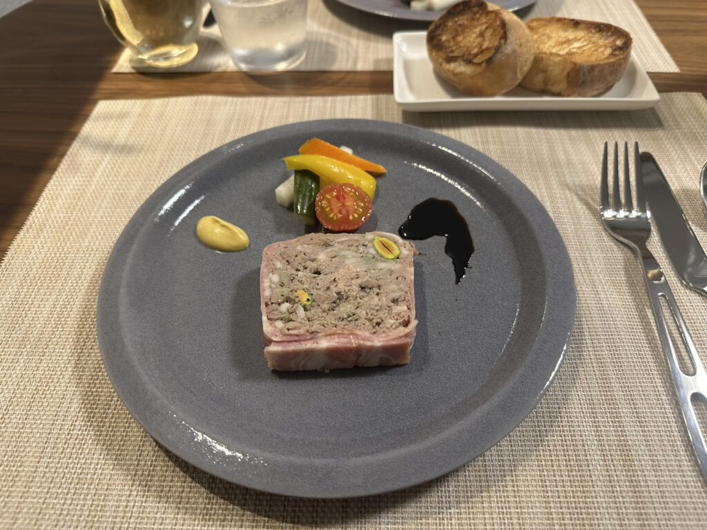 フランス料理の定番料理。数種類のお肉と鳥のレバーを捏ねて、蒸し上げます。 付け合わせに自家製ピクルスを添えました