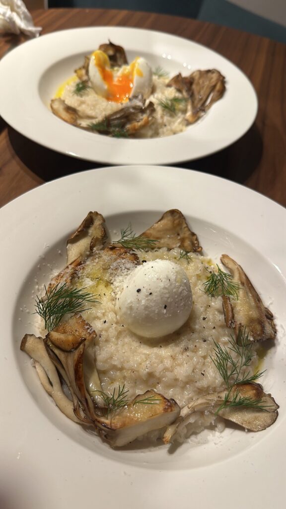 鶏ガラから取った出汁で仕上げたリゾットに舞茸のローストと白身だけ固めたゆで卵を合わせました。