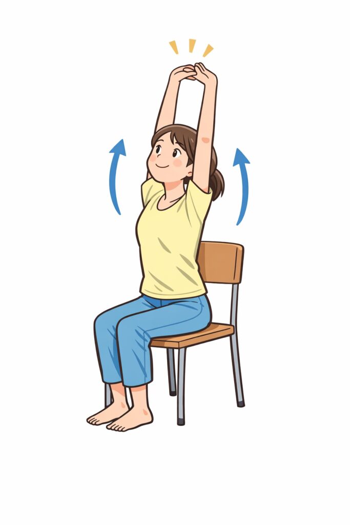 椅子に座ったまま両手を上に伸ばし、